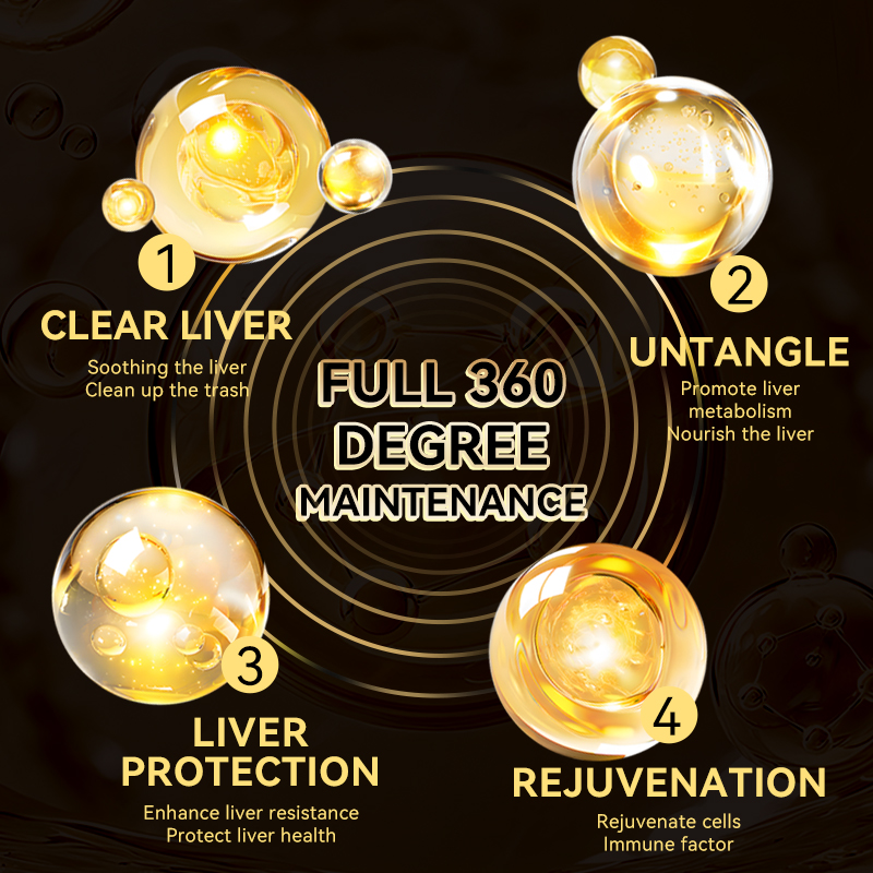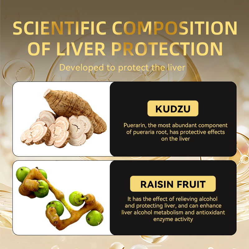 ① Poder antialcohol de cinco capas: Radix Puerariae combinado con Cordyceps rico en selenio, Myricaria glabra, oligopéptido de maíz, la combinación perfecta para la desintoxicación del alcohol.